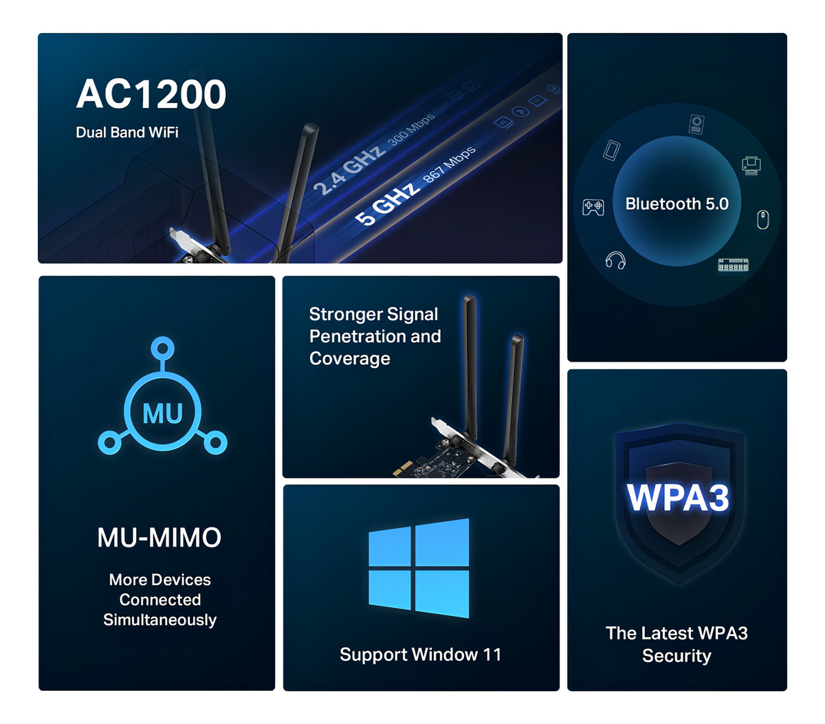 El adaptador WiFi PCIe 802.11ac de doble banda (MA30E), compatible con las bandas de 5 GHz y 2,4 GHz, alcanza velocidades de hasta 1167 Mbps. Proporciona señales Wi-Fi en dos bandas independientes para todas tus necesidades en línea. Elige la banda de 2,4 GHz (300 Mbps) para navegar, usar el correo electrónico y las redes sociales, o cambia a la banda de 5 GHz (867 Mbps) para jugar, ver streaming y descargar archivos grandes.