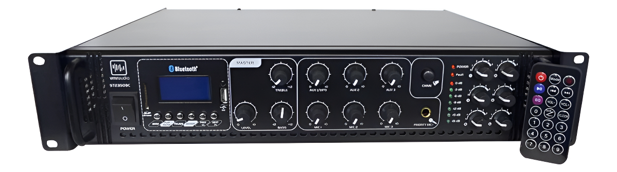 Incluye reproductor de MP3/SD con un luminoso display, radio FM, Bluetooth, ecualizador de 2 bandas y control remoto.