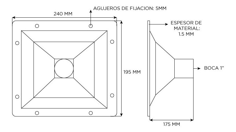 TIPO DE PRODUCTO : BOCINA PARA BAFLE TIPO: BOCINA PARA DRIVER DE ALTA FRECUENCIA DIÁMETRO NOMINAL DE BOCA 1 ” MATERIAL: METALICO ALUMINIO COLOR: NEGRO ROSCA: METALICA AGUJEROS DE FIJACION: 8 TAMAÑO DE AGUJEROS: 5 MM