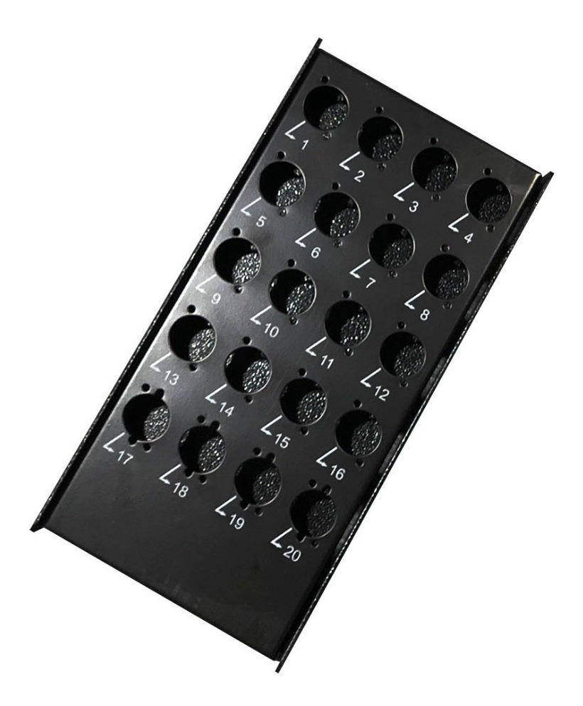 TIPO DE PRODUCTO: STAGE BOX / SNAKE / PATCHERA CANTIDAD DE CANALES: 20 ACCESORIOS PARA EL ARMADO: ESPIRAL – TUERCA PASA CABLE – TORNILLOS ESPESOR DE MATERIAL: 1.5MM COLOR: NEGRO SUPERFICIE: TEXTURIZADA