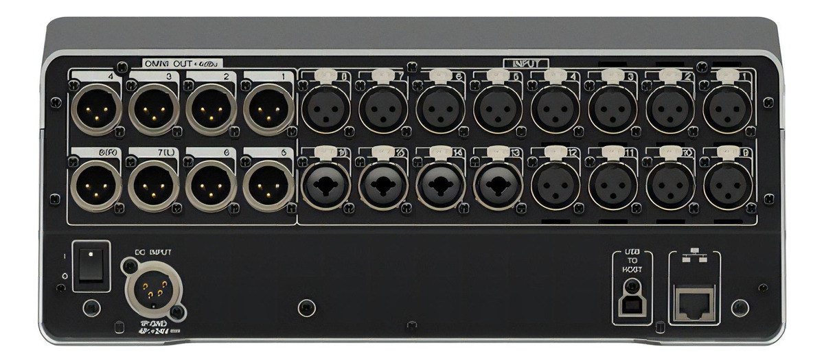 E/S locales: 16 entradas mic/línea (12 XLR + 4 XLR/TRS phones combo) y 8 salidas (XLR)