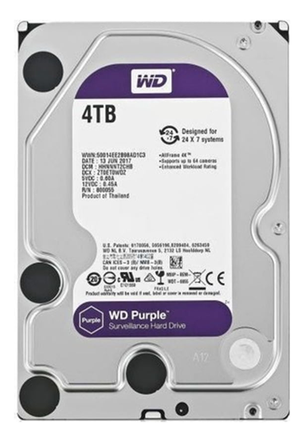 FeaturesAmplíe su visión con hasta 64 cámaras HD de secuencia únicaGestión proactiva del almacenamiento con WDDAÍndices de carga de trabajo mejorados que llegan hasta 180 TB por añoCapacidad4 TBFormato3.5-InchConectorSATACompatibilidadConecte hasta 64 cámaras por disco para los sistemas de seguridad con videovigilancia gracias a sus más de ocho ranura