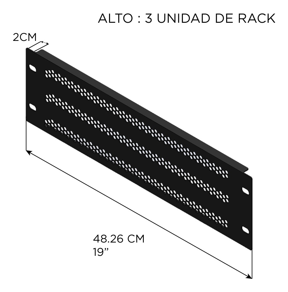TIPO DE PRODUCTO: CHAPA / PANEL PARA RACK NORMALIZADO 19″TIPO: VENTILACION MATERIAL ACEROCOLOR NEGROALTURA 3 UANCHO: 19 “ESPESOR: 1.5 MM