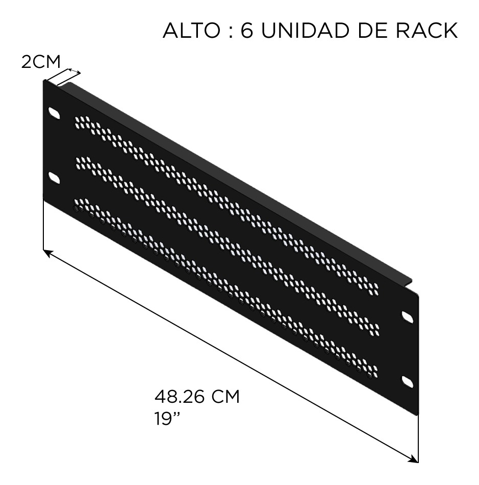 TIPO DE PRODUCTO: CHAPA / PANEL PARA RACK NORMALIZADO 19″TIPO: VENTILACION MATERIAL ACEROCOLOR NEGROALTURA 6 UANCHO: 19 “ESPESOR: 1.5 MM
