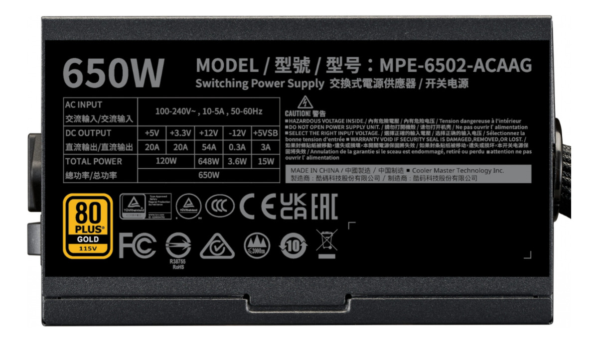 80 PLUS Rating 80 PLUS GoldRegulatory cTUVus, TUV, CE, FCC, BSMI, CCC, EAC, RCM, UKCA, RoHS2.0 / BIS, KC (Based on region’s requests.)Active PFC HDBATX Version ATX 12V Ver. 3.1Protections UVP / OVP / OPP / OTP / SCP / OCPInput Voltage 100-240V
