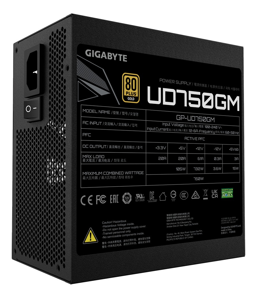 ModelGP-UD750GMTypeIntel Form Factor ATX 12V v2.31PFCActive PFC (>0.9 typical)Input Voltage100-240 Vac (full range)Input Current12-6AInput Frequency60-50 HzOutput Capacity750WDimension150 x 140 x 86 mmFan Type120mm Hydraulic Bearing(HYB)fan80 PLUSGoldEfficiency90% at typical loadMTBF>100,000 hoursProtectionOVP/OPP/SCP/UVP/OCP/OTPPower Good Signal100-150msHold Up Time>16msCable TypeFlat, All blackConnectors ATX/MB 20+4 Pin x 1 : 610mm*1CPU/EPS 4+4 Pin x 2 : 600mm*2PCI-e 6+2 Pin x 4 :…