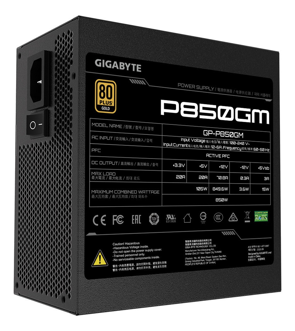 ModelGP-UD850GMTypeIntel Form Factor ATX 12V v2.31PFCActive PFC (>0.9 typical)Input Voltage100-240 Vac (full range)Input Current12-6AInput Frequency60-50 HzOutput Capacity850WDimension150 x 140 x 86 mmFan Type120mm Hydraulic Bearing(HYB)fan80 PLUSGoldEfficiency90% at typical loadMTBF>100,000 hoursProtectionOVP/OPP/SCP/UVP/OCP/OTPPower Good Signal100-150msHold Up Time>16msCable TypeFlat, All blackConnectors ATX/MB 20+4 Pin x 1 : 610mm*1CPU/EPS 4+4 Pin x 2 : 600mm*2PCI-e 6+2 Pin x 4 :…