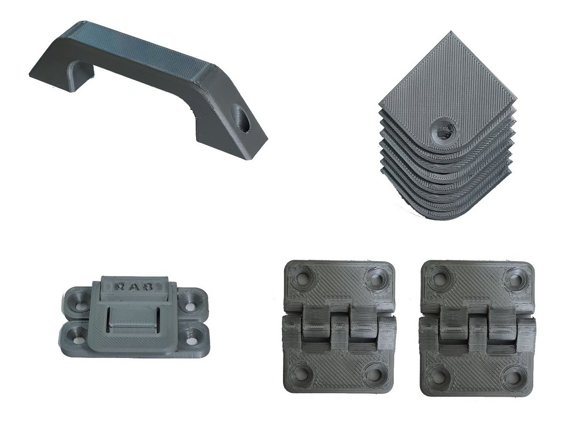 TIPO DE PRODUCTO: KIT HERRAJES PLASTICOSMATERIAL: PLASTICOIMPRESION 3D INCLUYE: 8 – ESQUINEROS PLANOS 2 – BISAGRAS 180°1 – CIERRE EXTERIOR1 – MANIJA EXTERIOR