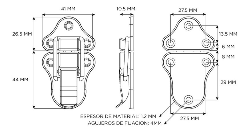 TIPO DE PRODUCTO: CIERRES RAPIDOTIPO: EXTERIORMATERIAL ACEROSUPERFICIE NIQUELADOORIFICIOS DE MONTAJE 4 MMLLAVE:NOPASO DE PERFIL: NOPORTACANDADO: NO