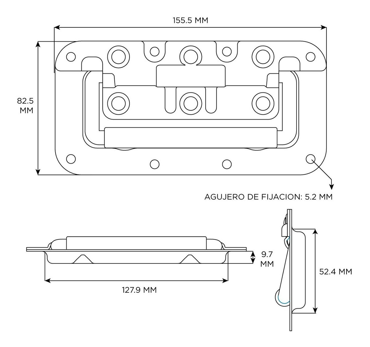 TIPO DE PRODUCTO: MANIJATIPO: EMBUTIRMATERIAL: ACEROSUPERFICIE: GALVANIZADOCOLOR:PLATEADOMATERIAL DE AGARRE: PVCCOLOR DE AGARRE: NEGROORIFICIOS DE MONTAJE 5MMRESORTE SÍ