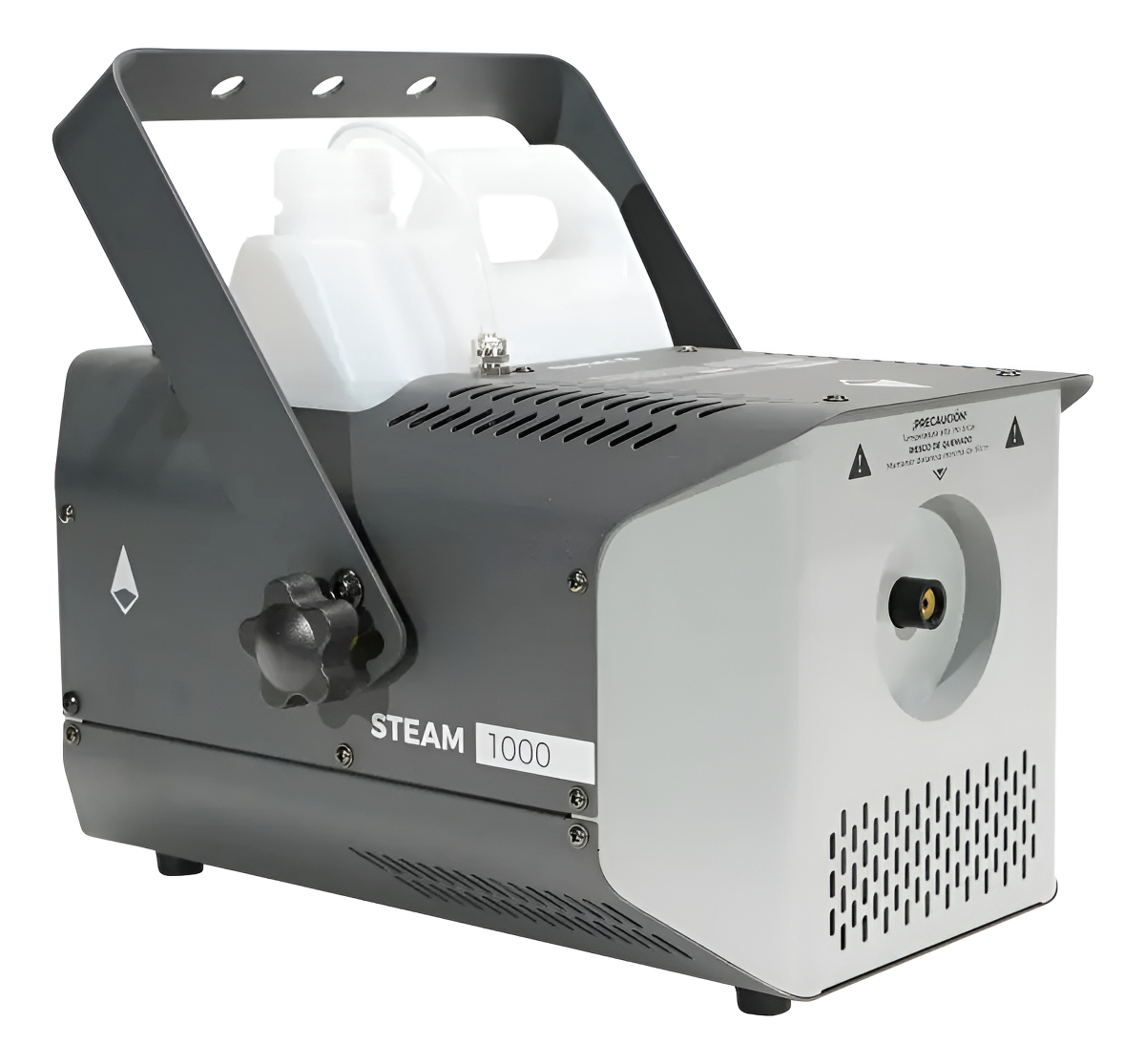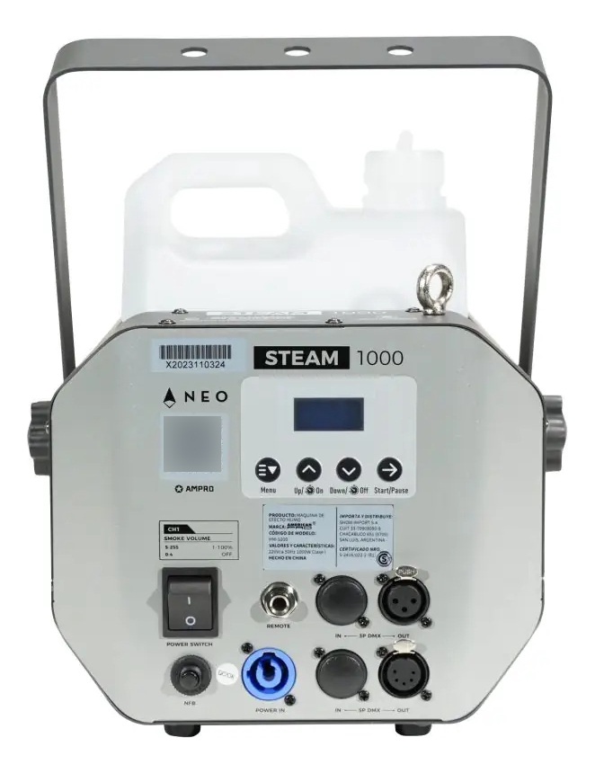 Conexión Alimentación In: tipo PowerCon Conexión DMX: XLR 3P & 5P In/Out Conexión DMX In: XLR 3P & 5P Conexión DMX Out: XLR 3P & 5P Salida: 7000 pies3/min Calentador: 1000W Tiempo de Calentamiento: 5 min Duración máx. en salida contínua: 28 segundos Capacidad Salida: 150 m³/min Dirección de salida: frontal Carcasa: Metálica Color: Gris, Negro. Consumo Líquido: 42 ml/min Capacidad del tanque: 3 L Longitud (mm): 339 mm x 295 mm x 338 mm Peso: 7 kg Clasificación IP: IP20