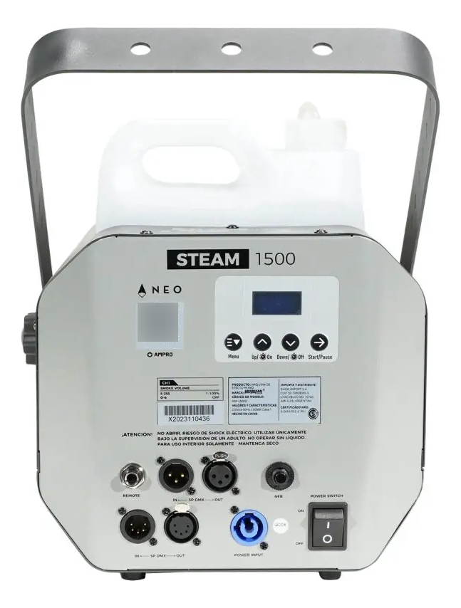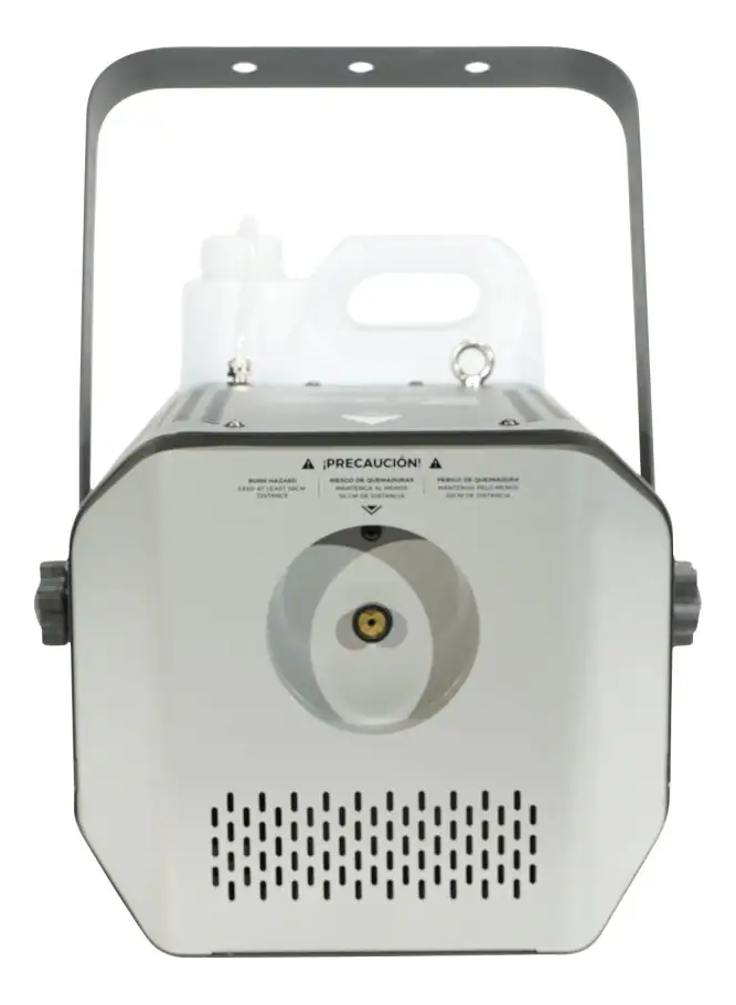 Conexión Alimentación In: Tipo Powercon Conexión DMX: XLR 3P In/Out, XLR 5P In/Out Conexión DMX In: XLR 3P, XLR 5P Conexión DMX Out: XLR 3P, XLR 5P Calentador: 1500 W Tiempo de Calentamiento: 8 min Duración máx. en salida contínua: 16 segundos Capacidad Salida: 21.000 pies³/min Dirección de salida: frontal Carcasa: Metálica Color: Gris, Negro. Consumo Líquido: 162 ml/min Capacidad del tanque: 5 L Longitud (mm): 436 mm x 321 mm x 414 mm Peso: 12 kg Clasificación IP: IP20