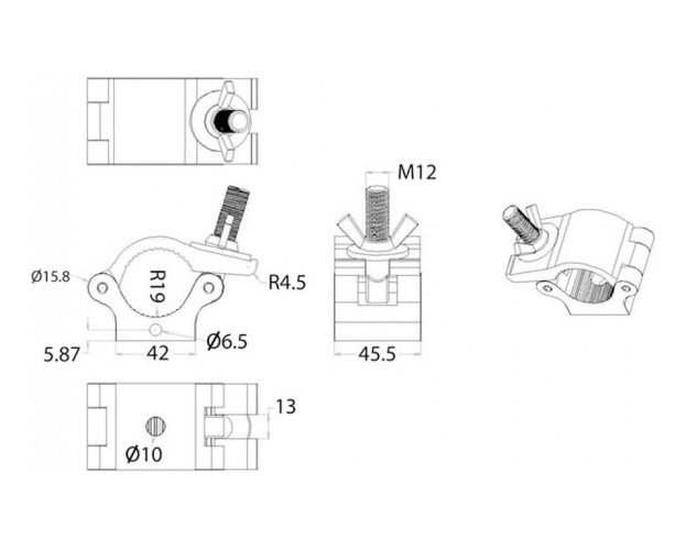 TIPO DE PRODUCTO: MORSAMATERIAL: ALUMINIOMEDIO ACOPLADOR PARA USAR CON TUBOS 38.1MM / 1.5″CAPACIDAD DE CARGA: 350KG/771.62LBPARA USAR CON TORNILLOS M10