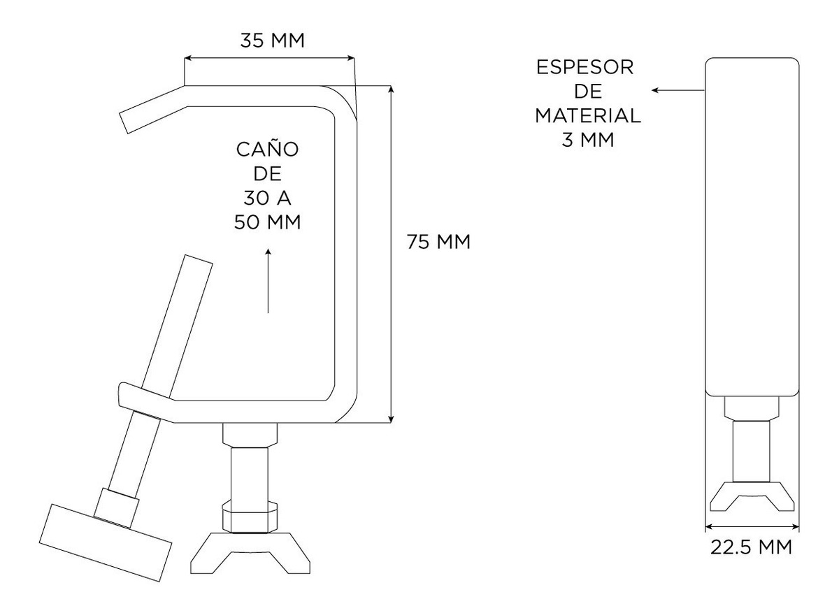 TIPO DE PRODUCTO: MORSA CLAMP PARA ESTRUCTURA USO: PARA EQUIPOS DE ILUMINACION MATERIAL ALUMINIO SOPORTA CAÑOS DE 30 A 50 MM COLOR: NEGRO SOPORTA: 40 KG ESPESOR: 3 MM