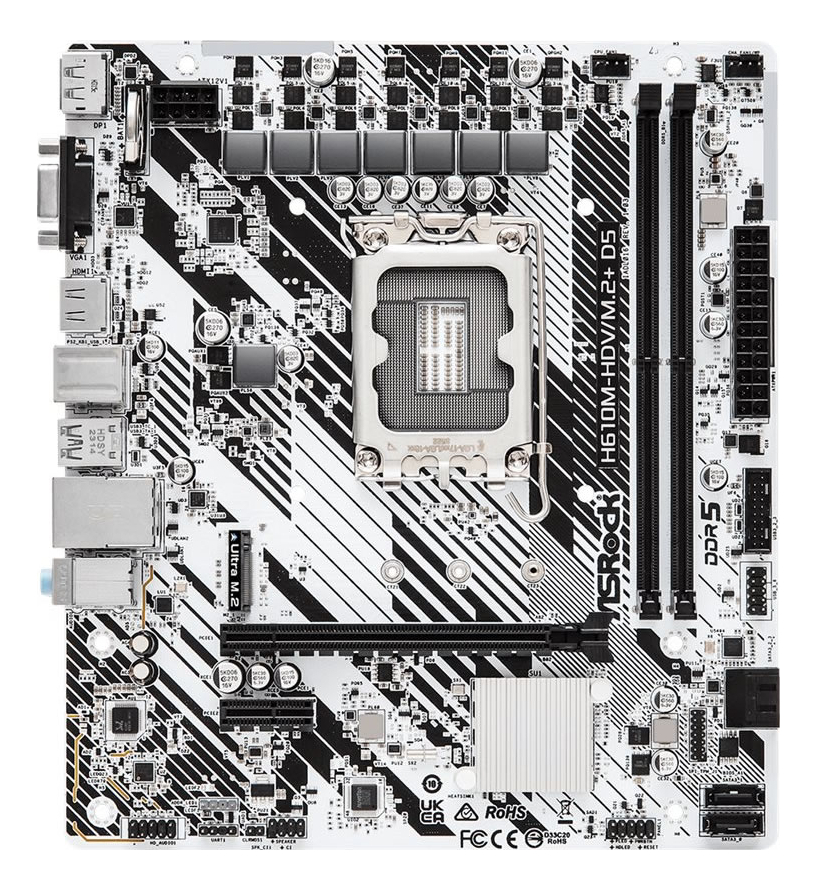 Formato de memoria RAM Micro ATXChipsets Intel h610Color NegroTipo de memoria RAM DDR5Plataforma IntelSocket Lga1700Capacidad máxima soportada de la memoria RAM 64 GBMarca ASRock