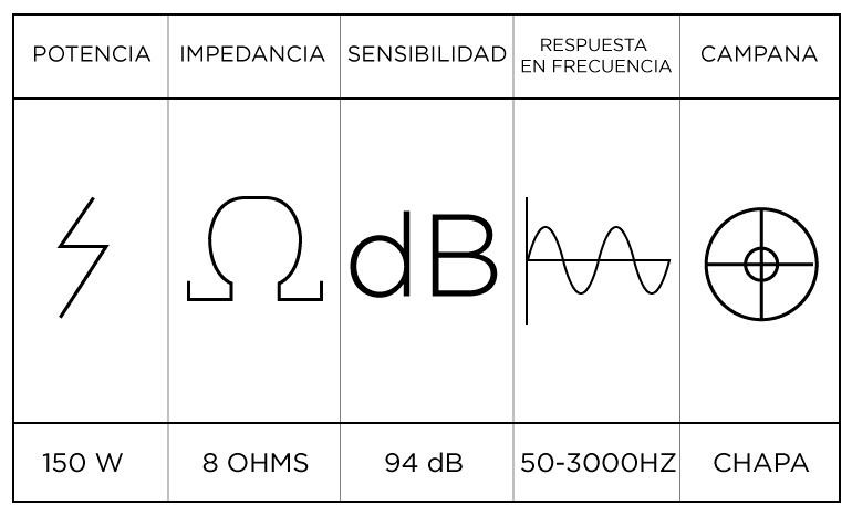 TIPO DE PRODUCTO: WOOFERPOTENCIA: 150W RMSIMPEDANCIA: 8 OHMSBOBINA: 2″RESP. EN FRECUENCIA: 50 A 3000 HZCAMPANA: CHAPASENSIBILIDAD: 94 DB SPL 1W/1MORIGEN: ASIA