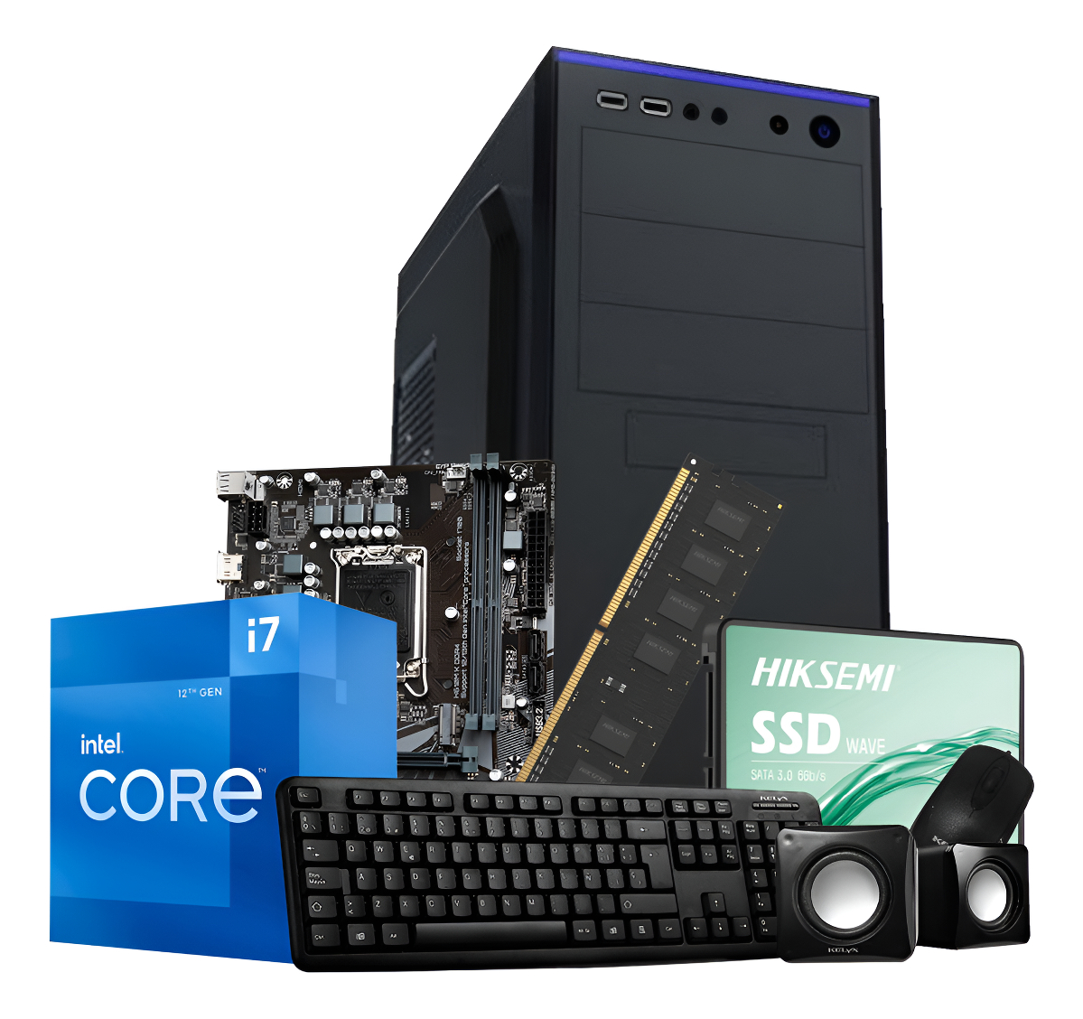 ESPECIFICACIONES: – GABINETE KIT KELYX LC727-14 FUENTE 500W TECLADO MOUSE Y PARLANTES – MOTHER GIGABYTE H610M K DDR4 LGA 1700 – PROCESADOR INTEL CORE I7 12700 BX8071512700 – MEMORIA DDR4 HIKSEMI 8GB 3200MHZ – DISCO SSD 480GB WAVE SATA – SIN SISTEMA OPERATIVO