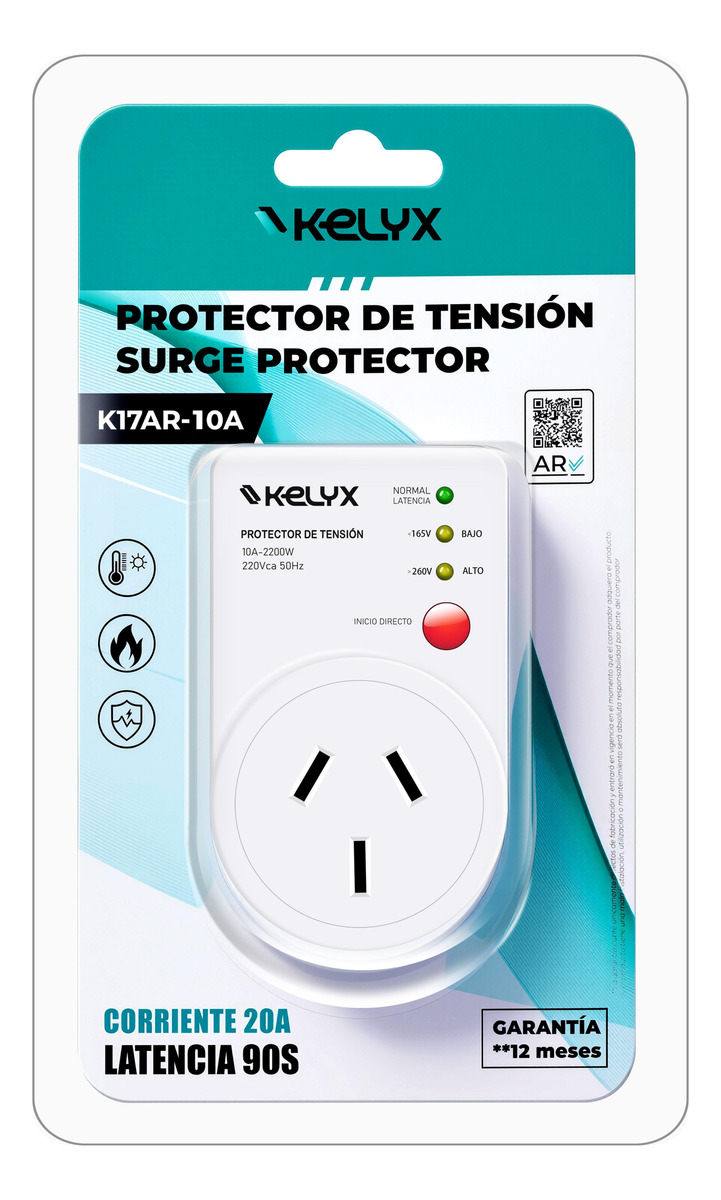 Modelo K15AR-10A Voltaje 220V AC Protector de sobretensión Sí Frecuencia 50Hz–60Hz Voltaje máximo 255V Voltaje mínimo 165V Tiempo de latencia 10s / 180s Corriente 10A Color Blanco Tipo de enchufe Estándar argentino