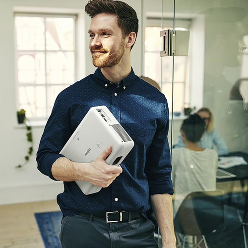 Su diseño compacto y ligero lo hace fácil de transportar, permitiendo disfrutar de proyecciones en cualquier lugar. Incluye conexión Wi-Fi y Bluetooth, brindando flexibilidad en la reproducción de contenido desde dispositivos móviles o computadores. Con un modo Eco que disminuye el consumo energético y reduce el ruido, es perfecto para ambientes silenciosos y prolongados.