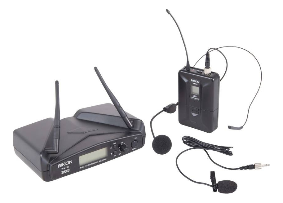 El sistema de micrófono inalámbrico WM700 ofrece 5 combinaciones diferentes con receptor de un solo canal, receptor de doble canal, transmisor de mano y transmisor de bolsillo con micrófono de diadema.