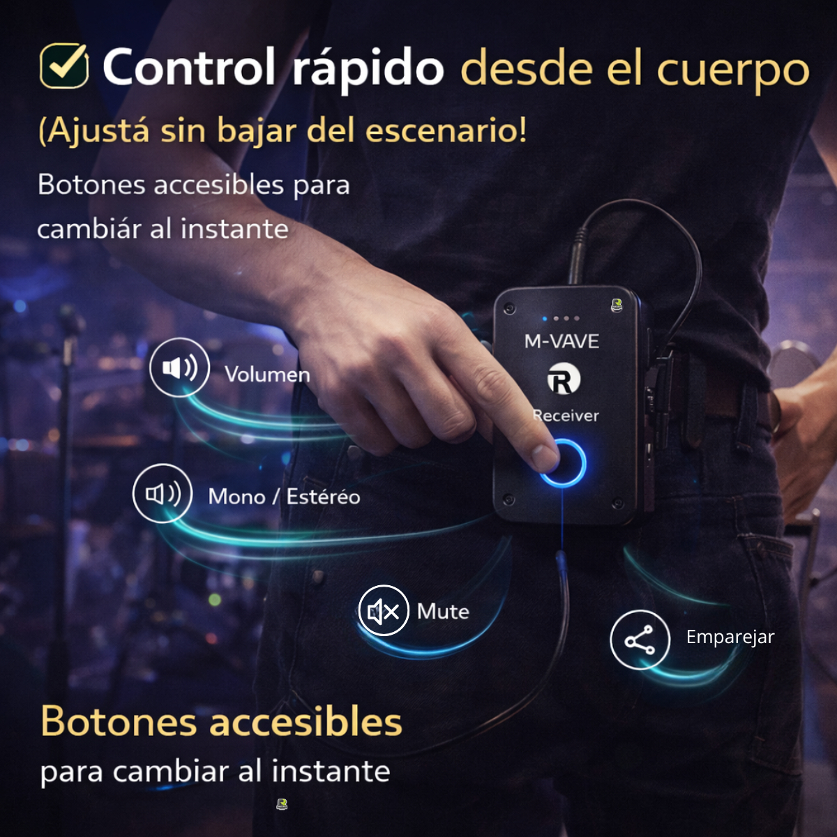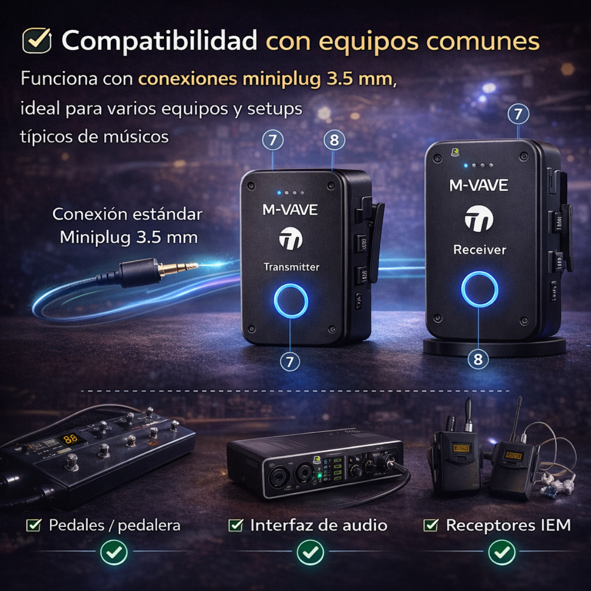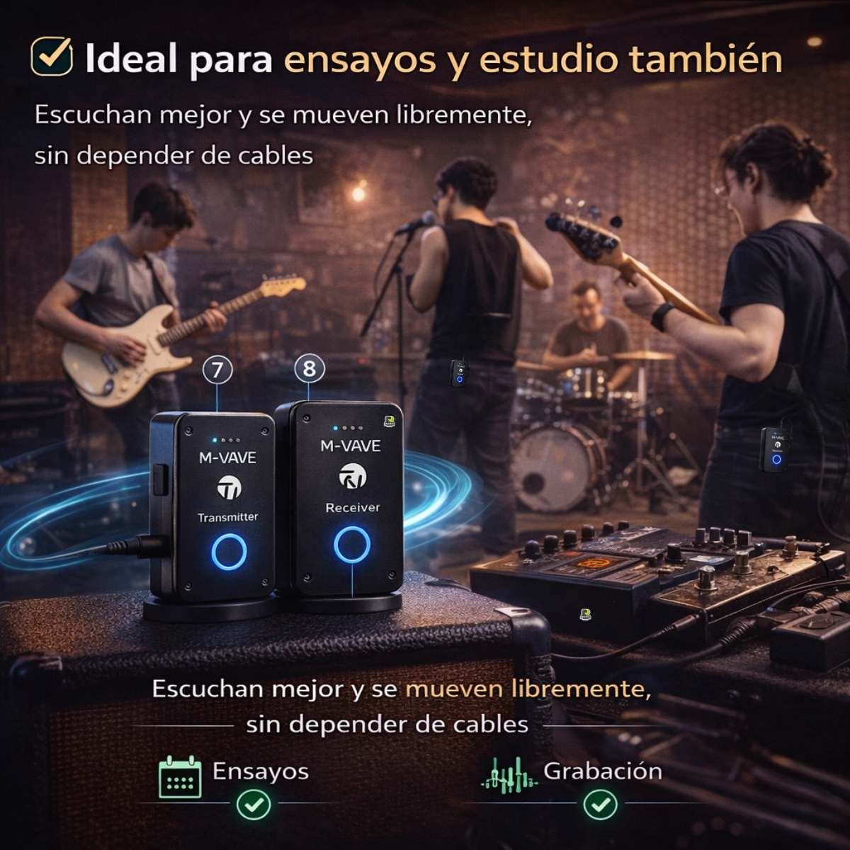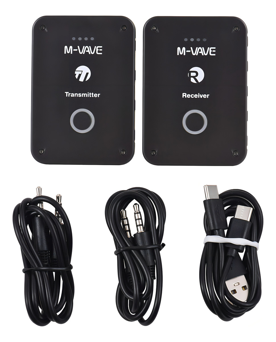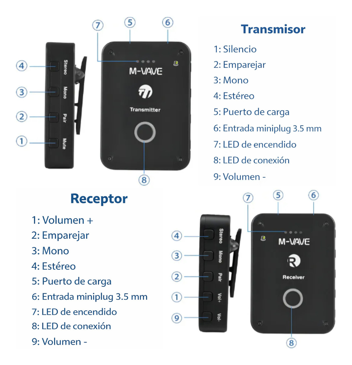Accesorios incluidos: 1 transmisor, 1 receptor, 1 cable de carga USB, 2 cables de audio.
