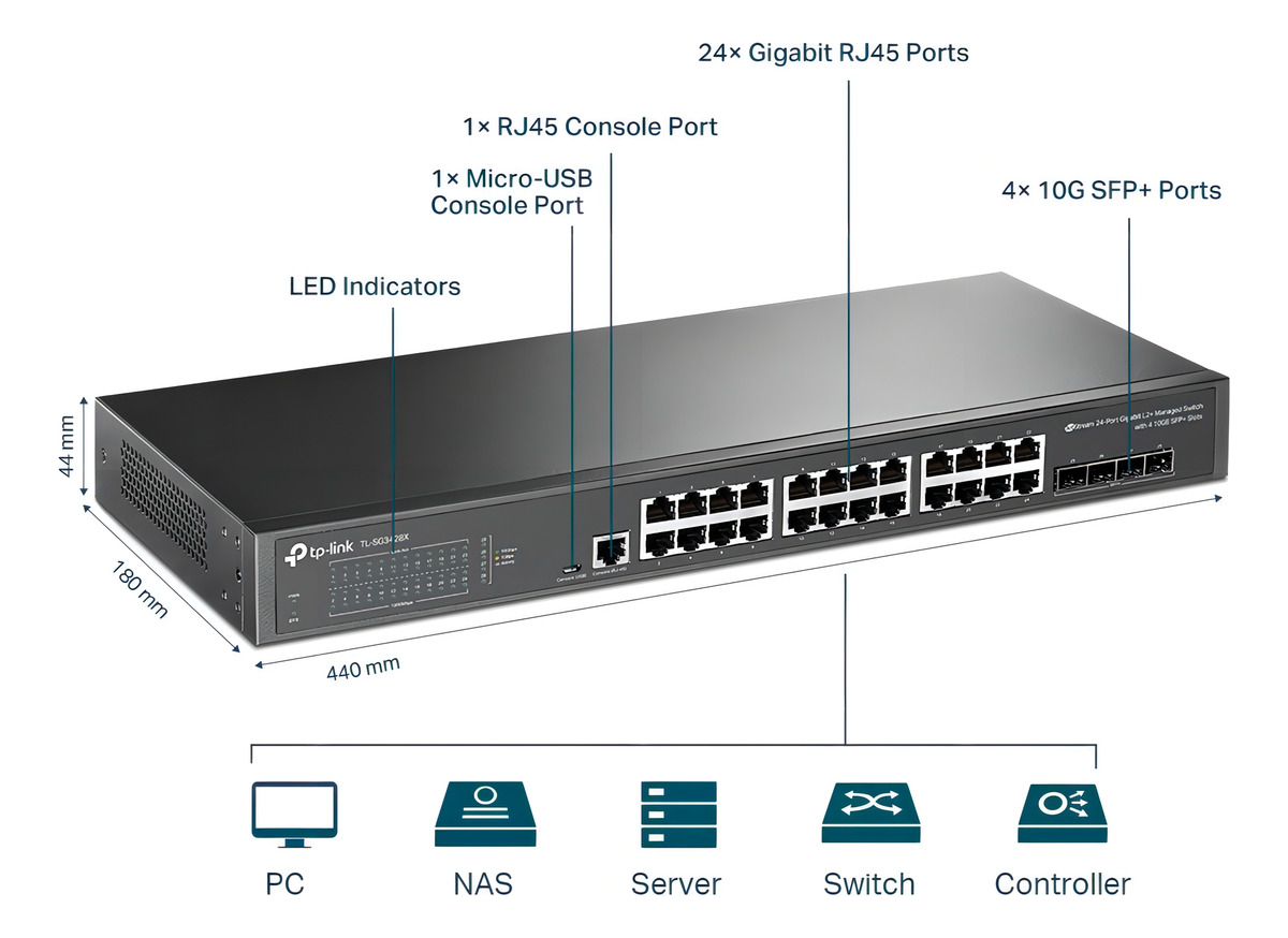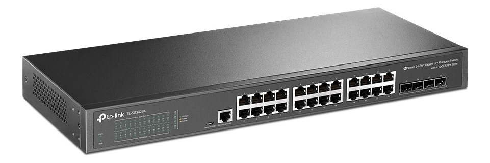 Velocidades Gigabit: 24 puertos Gigabit RJ45 ofrecen conexiones confiables y de alta velocidad a otros conmutadores y dispositivos.