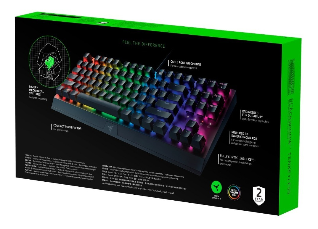 Descubre el teclado mecánico Razer Blackwidow V3 Tenkeyless, diseñado especialmente para jugadores que buscan la máxima precisión y velocidad. Este teclado compacto en color negro ofrece un layout QWERTY en inglés US y está equipado con switches Razer Yellow, que proporcionan una experiencia de escritura silenciosa y reactiva. Su arquitectura mecánica brinda una durabilidad excepcional, ideal para sesiones de juego intensas, mientras que las teclas anti-ghost aseguran que cada acción se registre sin interrupciones.