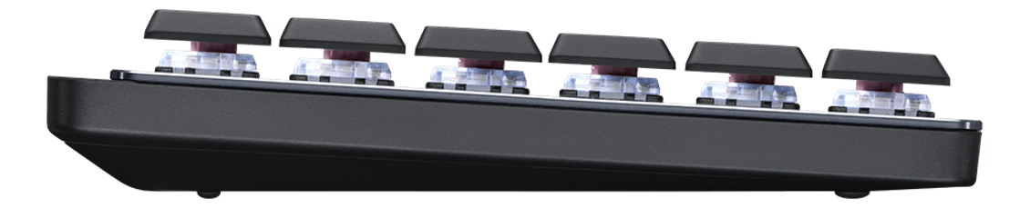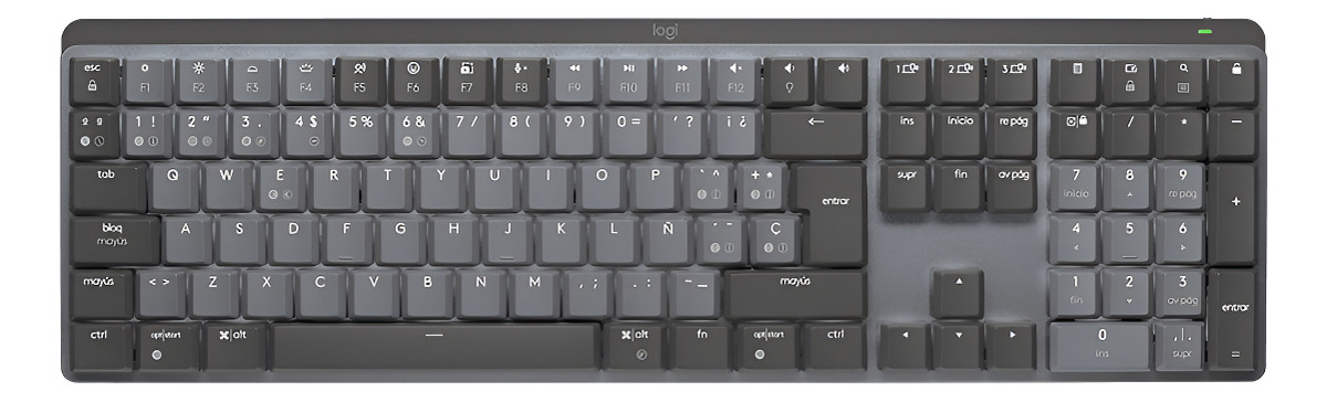 Dimensiones Altura: 131,55 mm Ancho: 433,85 mm Profundidad: 26,10 mm (incluidas las teclas) Peso: 828 g Receptor Logi Bolt Altura: 18,4 mm Ancho: 14,4 mm Profundidad: 6,6 mm Peso: 2 g Especificaciones técnicas Easy-Switch: conecta hasta tres dispositivos y alterna entre ellos Recargable por USB-C: hasta 15 días (o hasta 10 meses con la retroiluminación…