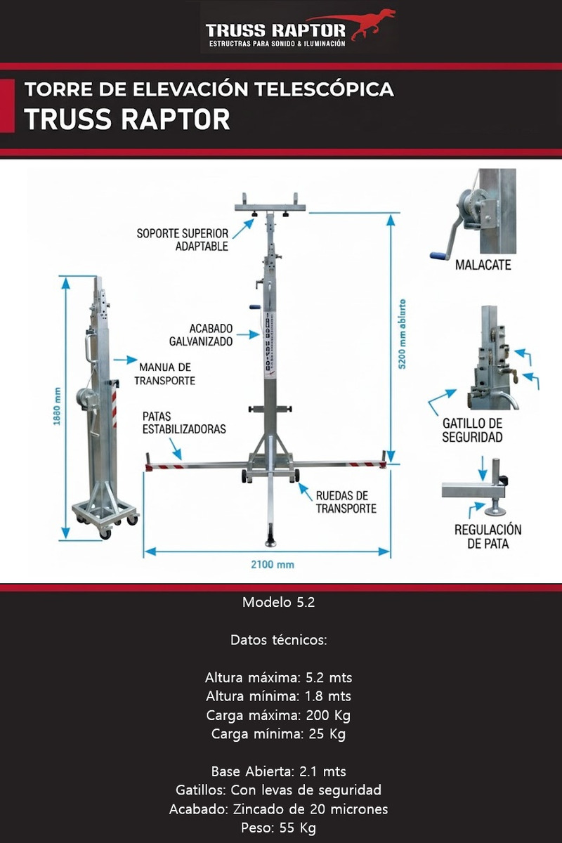 ¡Elevá tus estructuras con máxima seguridad! La torre Truss Raptor es la solución profesional para el montaje de Truss y sistemas de iluminación. Indispensable para cualquier empresa de eventos.