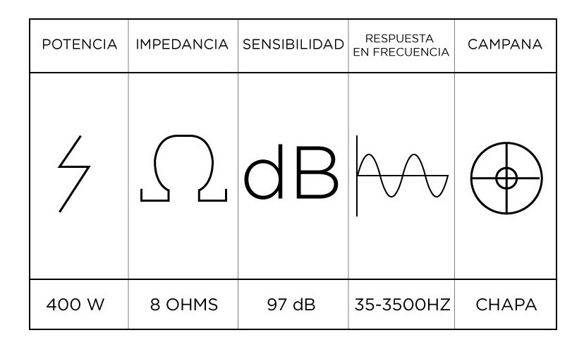 TIPO DE PRODUCTO: SUBWOOFER POTENCIA: 400W RMS IMPEDANCIA: 8 OHMS BOBINA: 3″ RESP. EN FRECUENCIA: 35 A 3500 HZ CAMPANA: ALUMINIO INYECTADO SENSIBILIDAD: 97 DB SPL 1W/1M