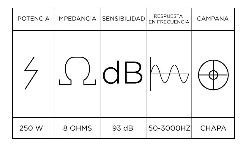 TIPO DE PRODUCTO: WOOFERPOTENCIA: 250W RMSIMPEDANCIA: 8 OHMSBOBINA: 2.5″RESP. EN FRECUENCIA: 50 A 3000 HZCAMPANA: CHAPASENSIBILIDAD: 93 DB SPL 1W/1M